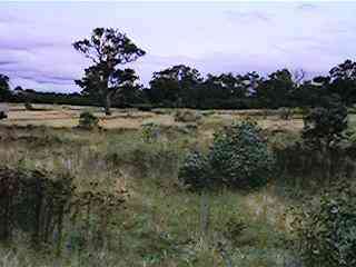 Across the grassland one approaches the woodland with scattered trees.